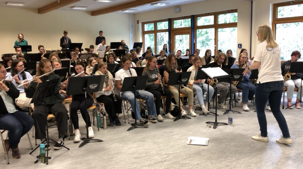 “Zum 15-jährigen Jubiläum und auf vielfachen Wunsch hin”, so die Leiterin, “fand am Samstag, den 23.09.23 zum ersten Mal ein Ehemaligentreffen statt.” Die aktuelle Concert Band, die momentan 52 Schüler und Schülerinnen umfasst, musizierte gemeinsam mit 34 Ehemaligen. “Bei so vielen Jahren kommt man schon fast auf 200 (ehemalige) Mitglieder”, sagt Gitta Ammer, “aber natürlich spielen nicht mehr alle ihr Instrument oder haben auch Zeit”. Trotzdem hatten sich alleine 20 Klarinetten neben Klavier, Flöten, Saxophonen, Trompeten, Euphonien, Posaunen, Bässen und Schlagzeugern eingefunden. Da viele der Ehemaligen ihr Instrument “lange nicht mehr geübt hätten”, sollte es beim ersten Treffen vor allem um den Spaß ohne den Druck eines Konzerts gehen. Umso überraschter waren alle, wie großartig das Klangergebnis war, als alle zusammen Herr der Ringe anstimmten. Auch Welcome to the Jungle oder Probiers mal mit Gemütlichkeit lief problemlos.