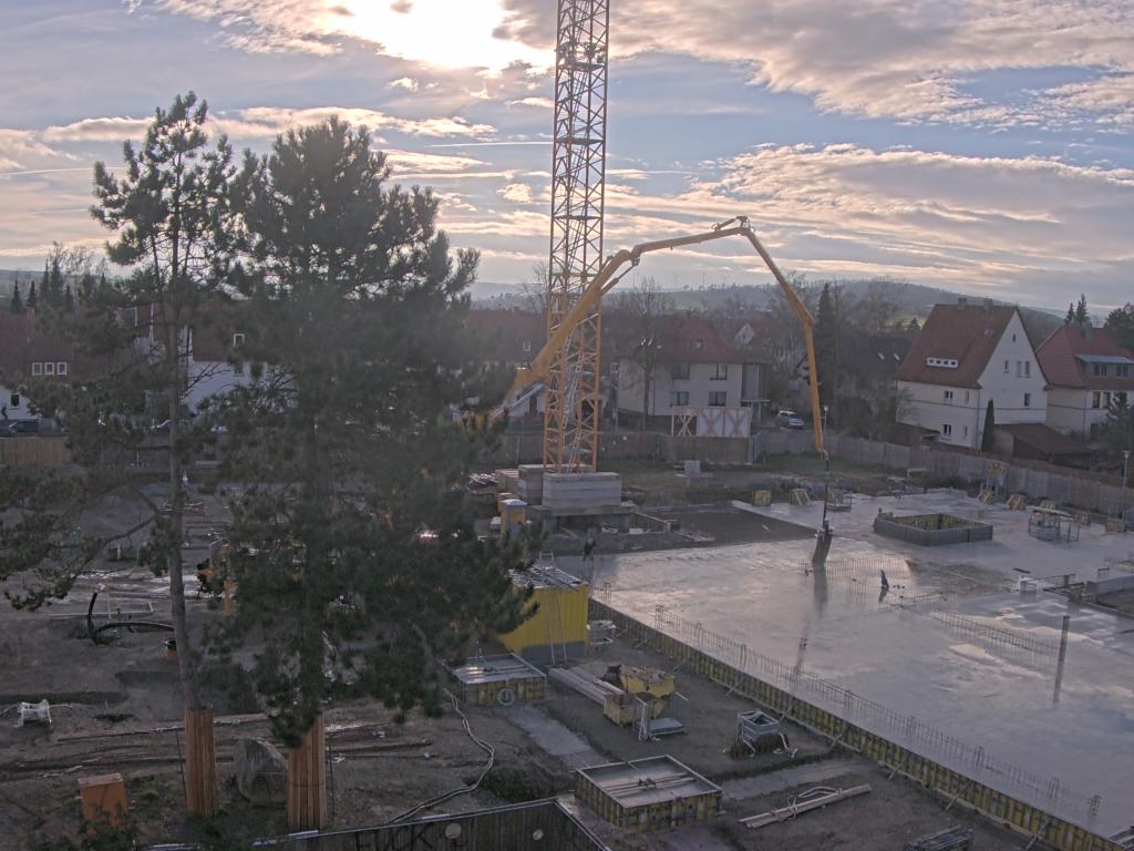 Kurz vor Weihnachten 2024 werden weitere Fundamente gegossen. Es geht schnell voran, denn das Wetter ist gut. Es sind 10 Grad Celsius und die Betonmischer fahren um die Wette. Die Fundamente für den Zwischenbereich und den Übergang zum Altgebäude werden mit viel Zement gefüllt. Man sieht, was man am Ende des Tages getan hat: Ein weiterer Teil des Gebäudes nimmt Gestalt an. Der Zwischenbereich zwischen den Hauptgebäudeteilen, wo in Zukunft die Klassen untergebracht werden.
