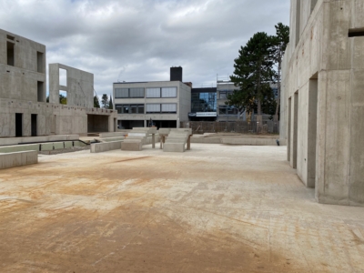 Auf der linken Seite sieht man die verschiedenen Versorgungstürme der einzelnen Ebenen für das EGD. Hier werden u.a. die 5. und 6. Klassen untergebracht. Von da aus wird man mit einer Holzständerbauweise das Haus befüllen. Danach folgen die Innenausbauten.