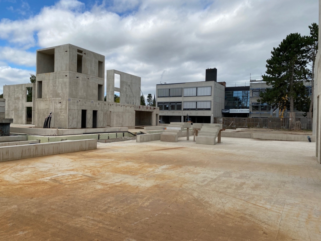 Auf der linken Seite sieht man die verschiedenen Versorgungstürme der einzelnen Ebenen für das EGD. Hier werden u.a. die 5. und 6. Klassen untergebracht. Von da aus wird man mit einer Holzständerbauweise das Haus befüllen. Danach folgen die Innenausbauten.