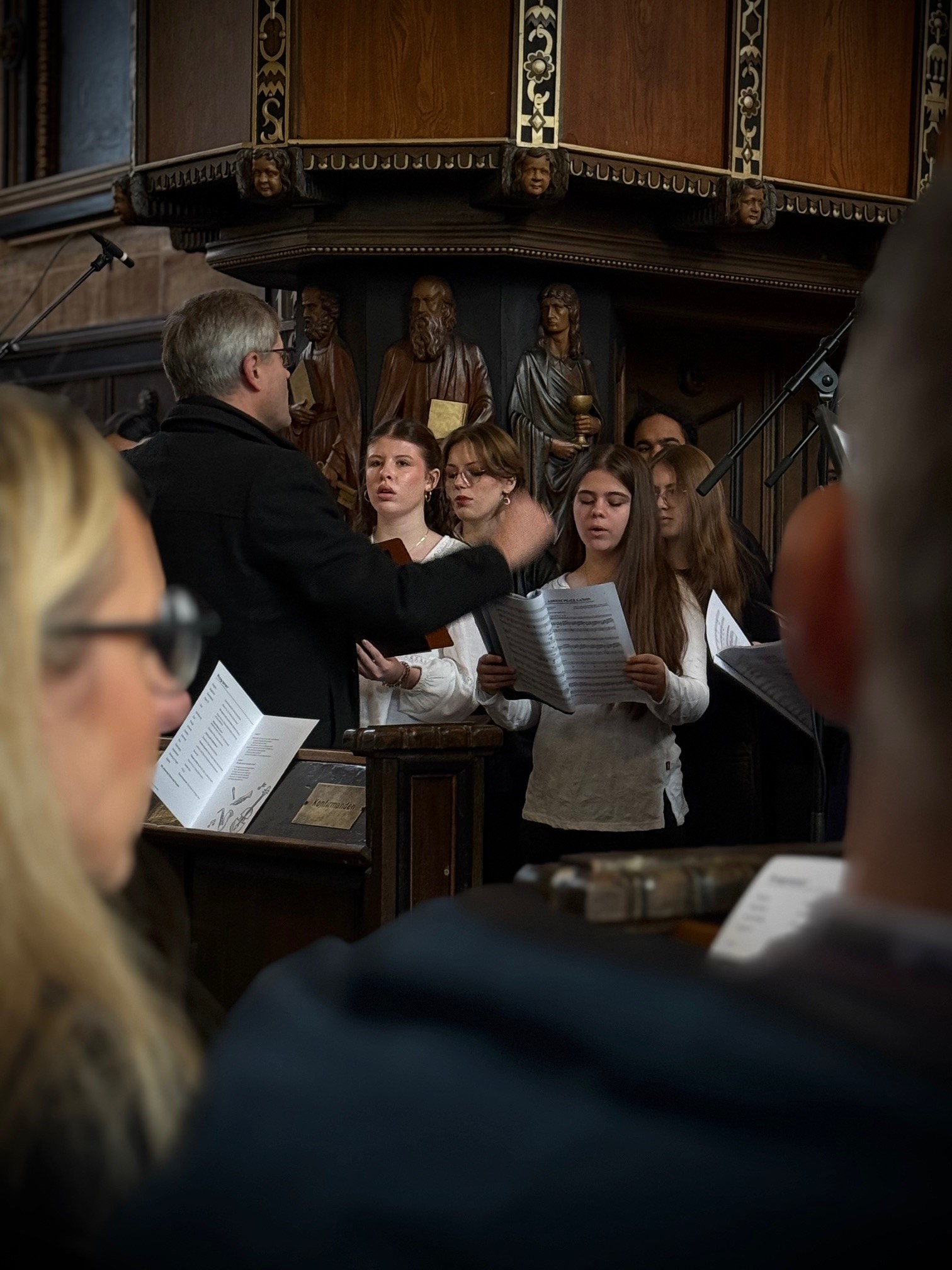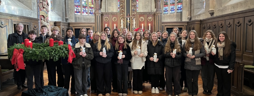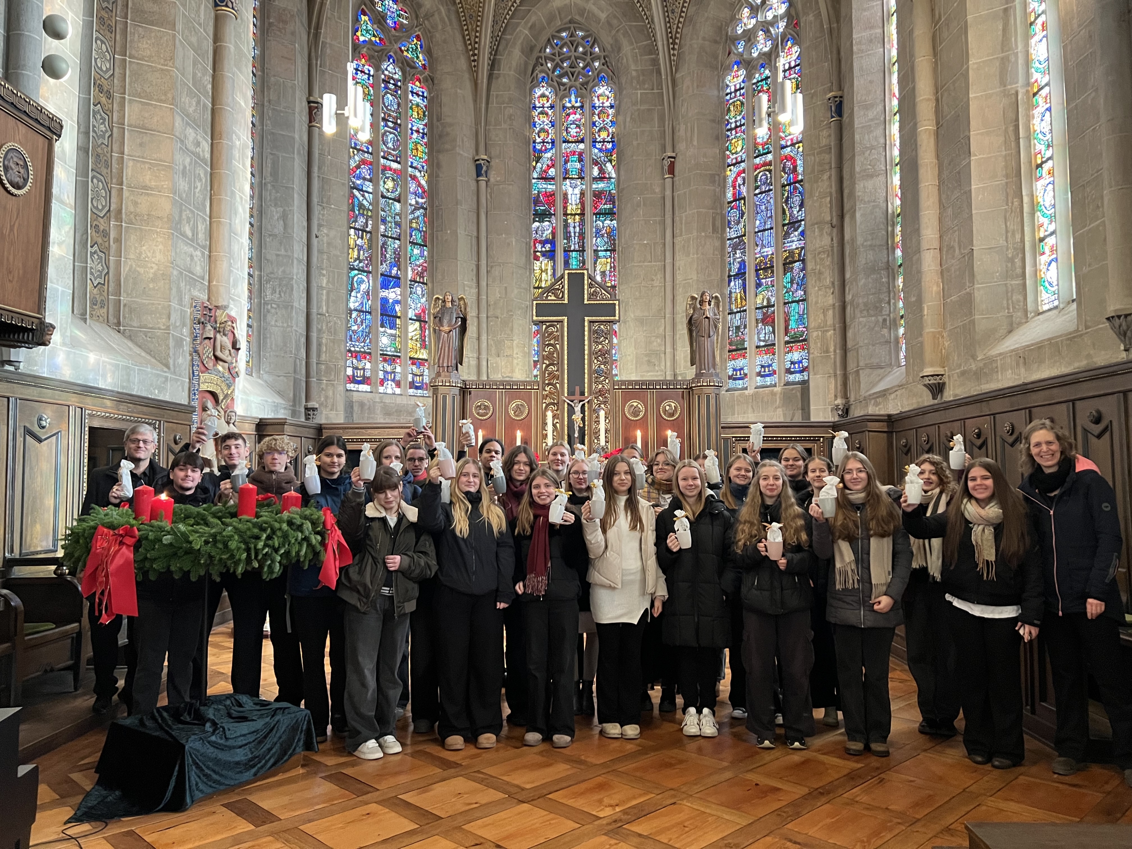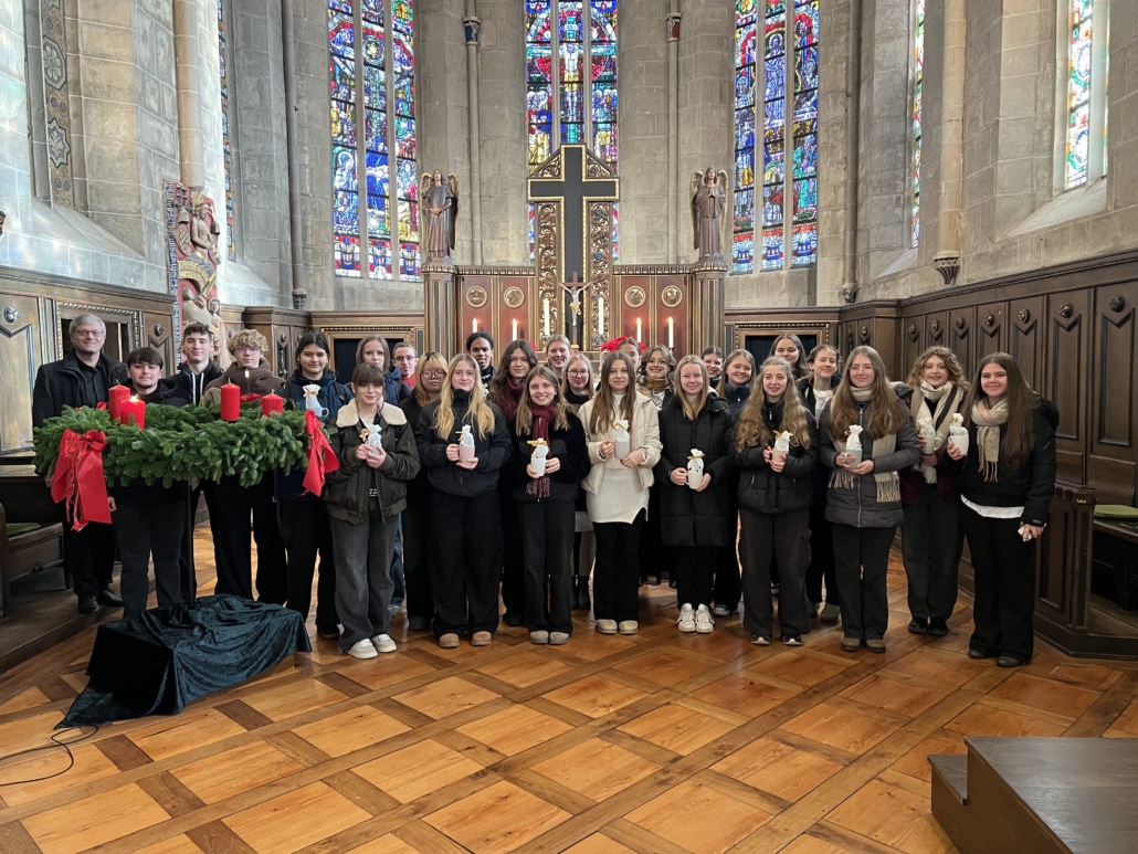 Wie schon vor zwei Jahren hat auch in diesem Jahr der Schulchor der Jahrgänge 8-13 diesen Gottesdienst wieder musikalisch mitgestaltet. Gemeinsam mit Linn Hillebrandt (Flöte) und Ulle Pfefferle (Klavier) sang der Chor unter der Leitung von Stephan Diedrich adventliche und weihnachtliche Lieder und Songs, darunter auch eine Bearbeitung des berühmten Kanons von Johann Pachelbel und ein „Calypso Lullaby“, das nicht nur zum Schlafen, sondern genau so gut auch zum Tanzen einladen könnte.