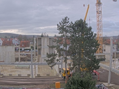 Auch wenn im Eichsfelder Tageblatt im November 2025 darüber spekuliert wird, ob die Baustelle stillgelegt ist, zeigen weitere Baumaßnahmen, dass dem nicht so ist. In der Tat gab es einige Woche Ruhe auf der Baustelle. Die Holzeinbauten werden erst 2026 eingebaut. Allerdings tut sich was: Es werden in großem Stil Betonstreben auf der gesamten Baustelle eingebaut. Ein Kran der Fa. Klostermeier stellt die Streben auf. Auch wenn aus dem Lehrerzimmer zu hören ist, dass dies die Kreuze für die neue Kapelle im Neubau seien, dem ist (leider) nicht so. Die Querstreben dienen der Verzahnung für die noch zu stellenden Holzelemente.