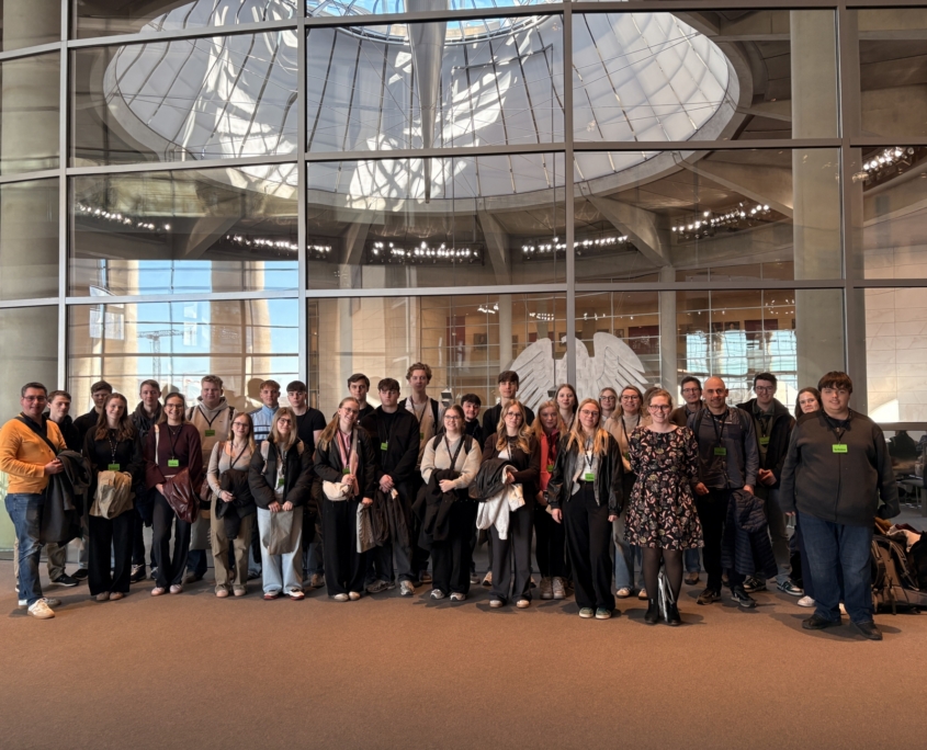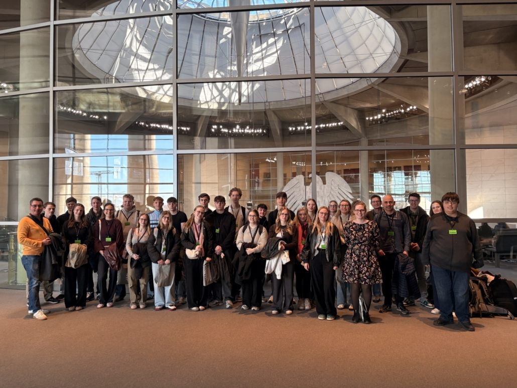 Unsere Exkursion nach Berlin hat uns viele Einblicke in Politik, Medien und gesellschaftliche Themen gegeben. Während unseres Aufenthalts haben wir verschiedene wichtige Orte besucht, darunter den Bundestag, das ZDF und das Bundesministerium der Verteidigung (BMVg). Dabei konnten wir mehr darüber lernen, wie politische Entscheidungen getroffen werden, welche Rolle Medien in der Demokratie spielen und vor welchen Herausforderungen unsere Gesellschaft steht. Außerdem haben wir bei einer nachhaltigen Stadtführung mehr über aktuelle Probleme wie steigende Mieten, Gentrifizierung und Wohnungsnot in Berlin erfahren. In diesem Beitrag berichten wir über unsere Eindrücke, Erlebnisse und das Wissen, das wir bei den verschiedenen Stationen unserer Berlinfahrt gesammelt haben.