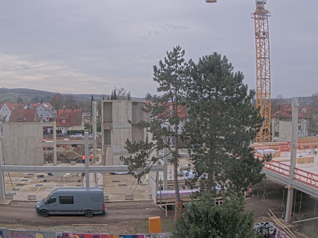 Jetzt geht es schneller als gedacht. Der Holzbauer benötigt für jede Etage jetzt etwa sechs Wochen. Teilweise stehen schon die Außenwände, einzelne Deckenteile und auch schon die Pfosten, die den Übergang bzw. Durchgang zum alten Hauptgebäude bilden. Die Bauarbeiter bauen bereits auf der nächsten Ebene.