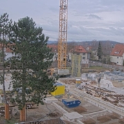 Jetzt geht es schneller als gedacht. Der Holzbauer benötigt für jede Etage jetzt etwa sechs Wochen. Teilweise stehen schon die Außenwände, einzelne Deckenteile und auch schon die Pfosten, die den Übergang bzw. Durchgang zum alten Hauptgebäude bilden. Die Bauarbeiter bauen bereits auf der nächsten Ebene.