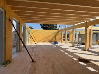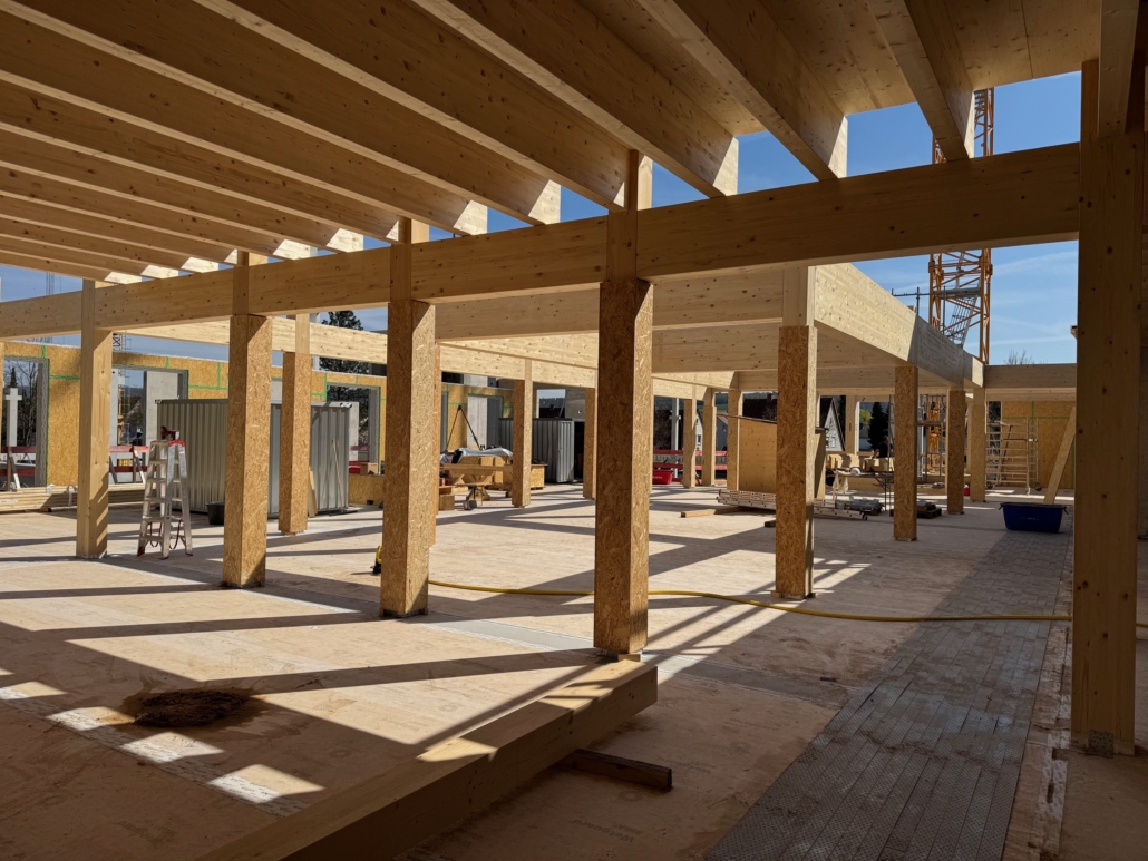 Der Holzbauer arbeitet fast rund um die Uhr. Innerhalb von vier Wochen konnte in einem Bauabschnitt das Erdgeschoss bereits vollständig mit dem Holzbau „versorgt“ werden. Nunmehr ist das erste Obergeschoss dran. Hier kann man bereits die Clustermitte und die einzelnen Klassenräume erkennen. Und auch hier geschieht schon sehr viel. Die Decke für das zweite Geschoss wird gerade eingebaut. Bald kann es in den zweiten Bauabschnitt gegenüber gehen. Und auch der Durchgang von der Bushaltestelle zum Altgebäude ist bereits fast fertig.