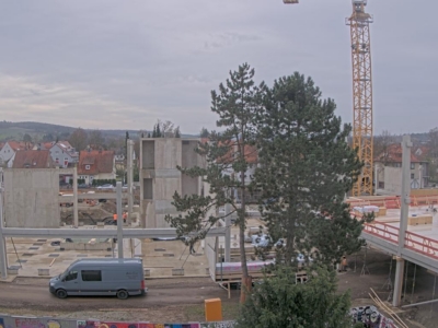 Auch wenn im Eichsfelder Tageblatt im November 2025 darüber spekuliert wird, ob die Baustelle stillgelegt ist, zeigen weitere Baumaßnahmen, dass dem nicht so ist. In der Tat gab es einige Woche Ruhe auf der Baustelle. Die Holzeinbauten werden erst 2026 eingebaut. Allerdings tut sich was: Es werden in großem Stil Betonstreben auf der gesamten Baustelle eingebaut. Ein Kran der Fa. Klostermeier stellt die Streben auf. Auch wenn aus dem Lehrerzimmer zu hören ist, dass dies die Kreuze für die neue Kapelle im Neubau seien, dem ist (leider) nicht so. Die Querstreben dienen der Verzahnung für die noch zu stellenden Holzelemente.